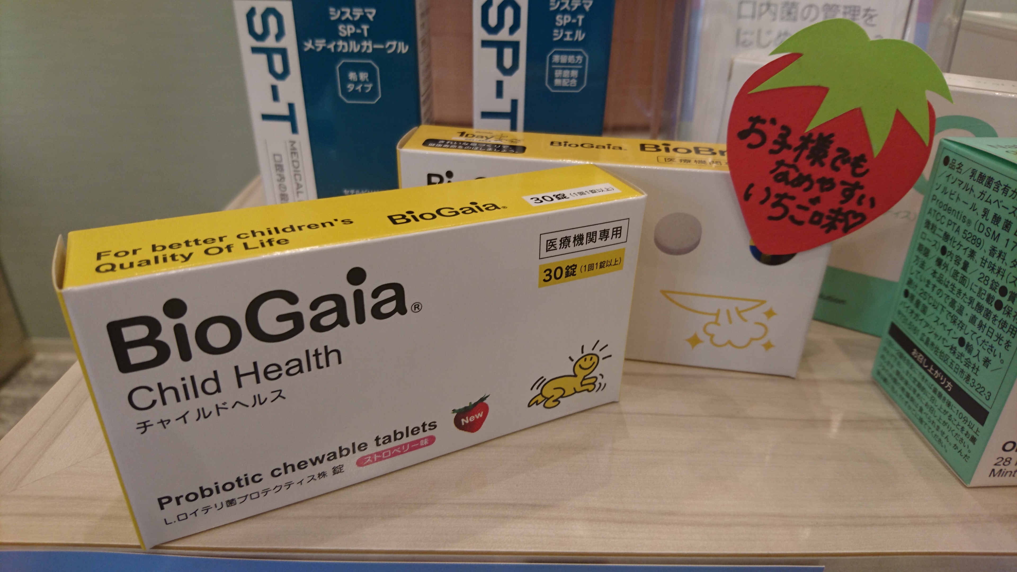 おだがき歯科クリニックでは、スウェーデンにある企業(バイオガイア社)が研究開発したL.ロイテリ菌という善玉菌を補給し、虫歯菌などの悪玉菌を抑制してくれる乳酸菌を練り込んだタブレット「チャイルドヘルス(ストロベリー味)」を使った予防を推奨しています。(大人の方にもオススメです。)