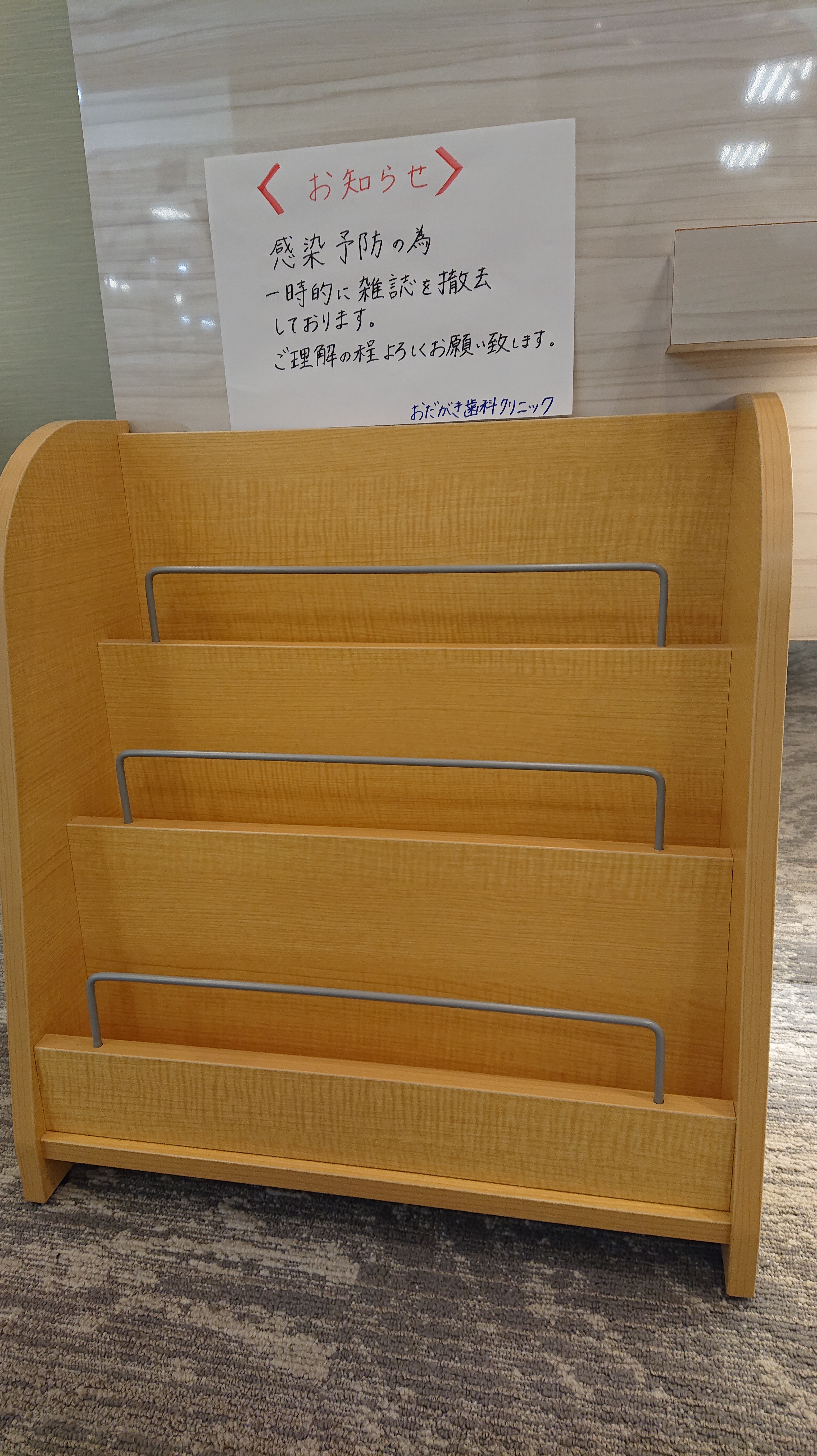 多くの患者さんが手に取る雑誌類は感染源となる可能性があるため、感染予防策として、一時的にすべて撤去しております。